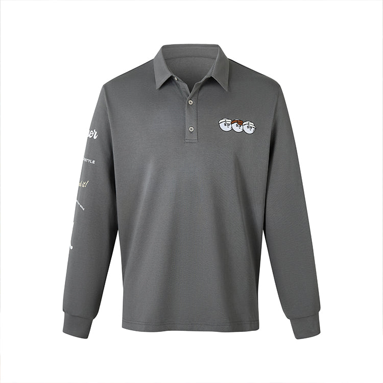 This long-sleeved lapel T-shirt is American street style . The cartoon character pattern on the chest adds a sense of fun, and the sleeves are decorated with multiple English prints, which can easily create a personalized casual style. Suitable for daily wear or casual occasions.
